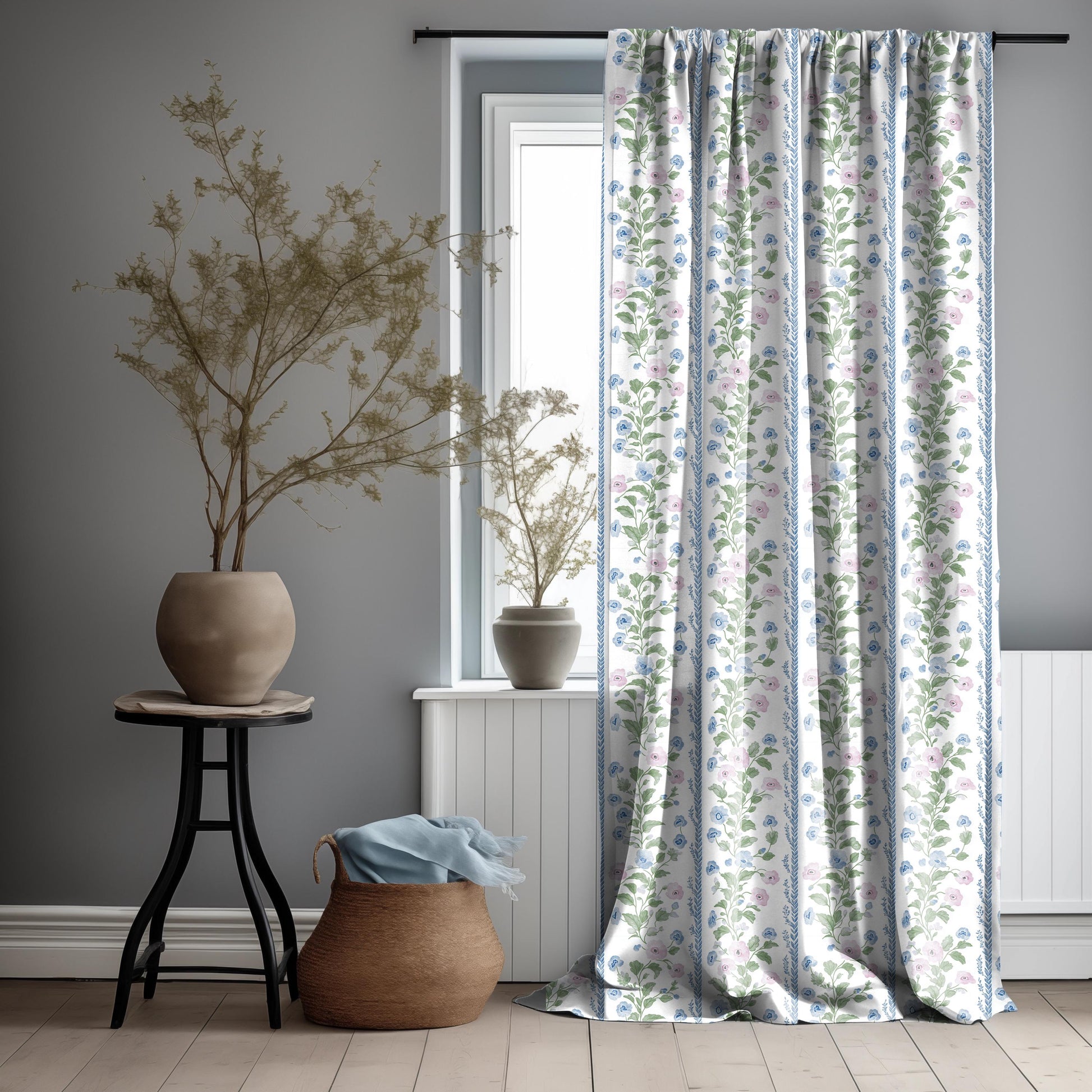 Curtains 100% Linen with floral stripe preppy pink green white print PREWASHED - kitchen Living room farmhouse linen window panel heritage