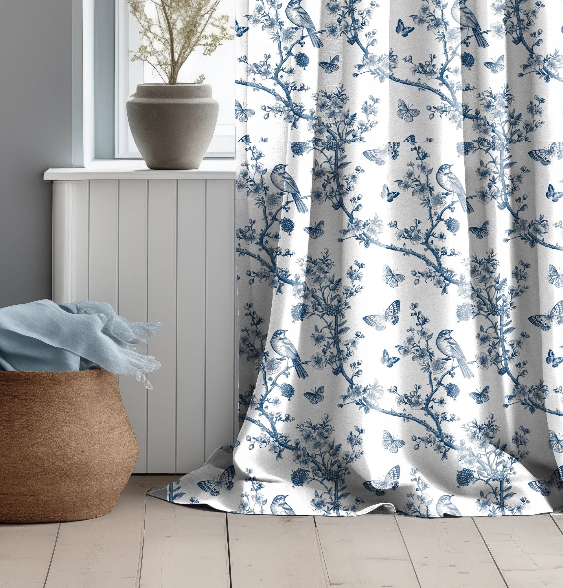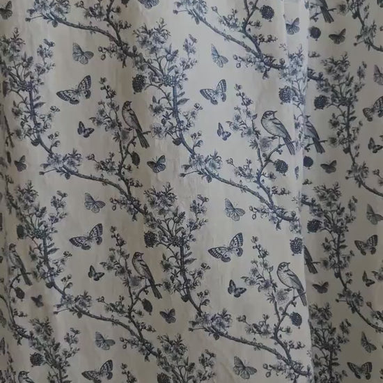 Designer blue Floral Linen curtains, indigo blue French Toile de joy curtain panel, Farmhouse Botanical printed curtains for living room