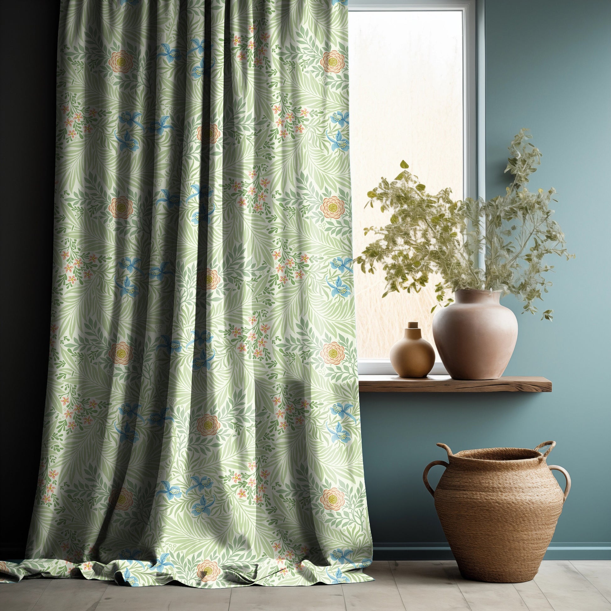 William Morris Curtain Panel Lakspur, Floral Botanical green Print Curtain Panels in custom size, Curtains for living room