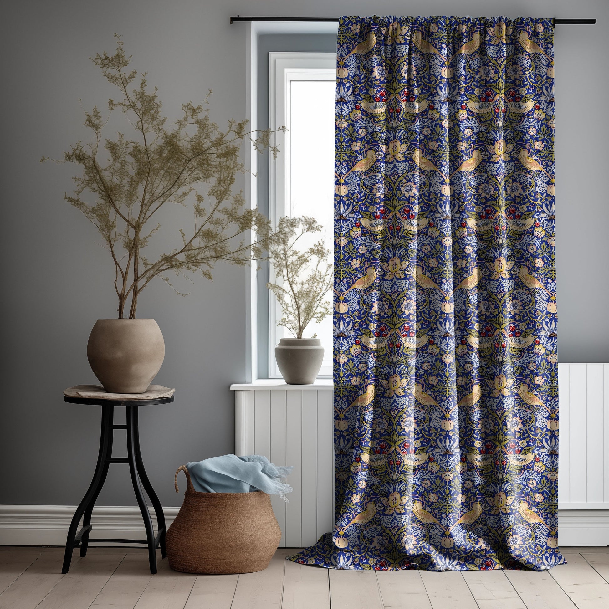 William Morris Curtain Panel Strawberry Thief, Floral with birds and strawberries Print Pattern Curtain Panels, Curtains for living room