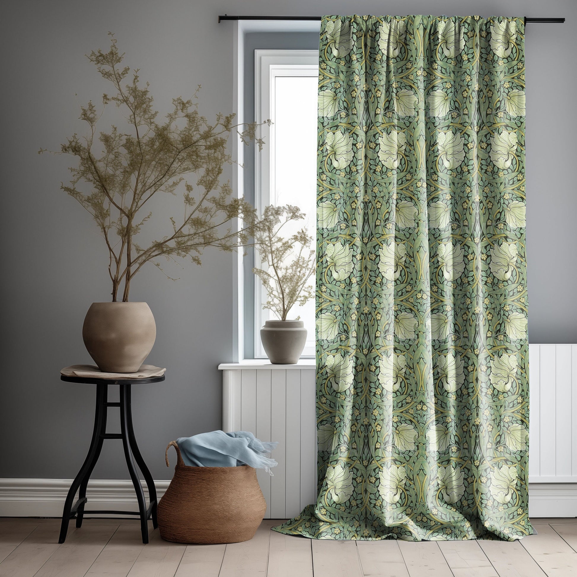 Linen blend curtains with William Morris print Strawberry thief.