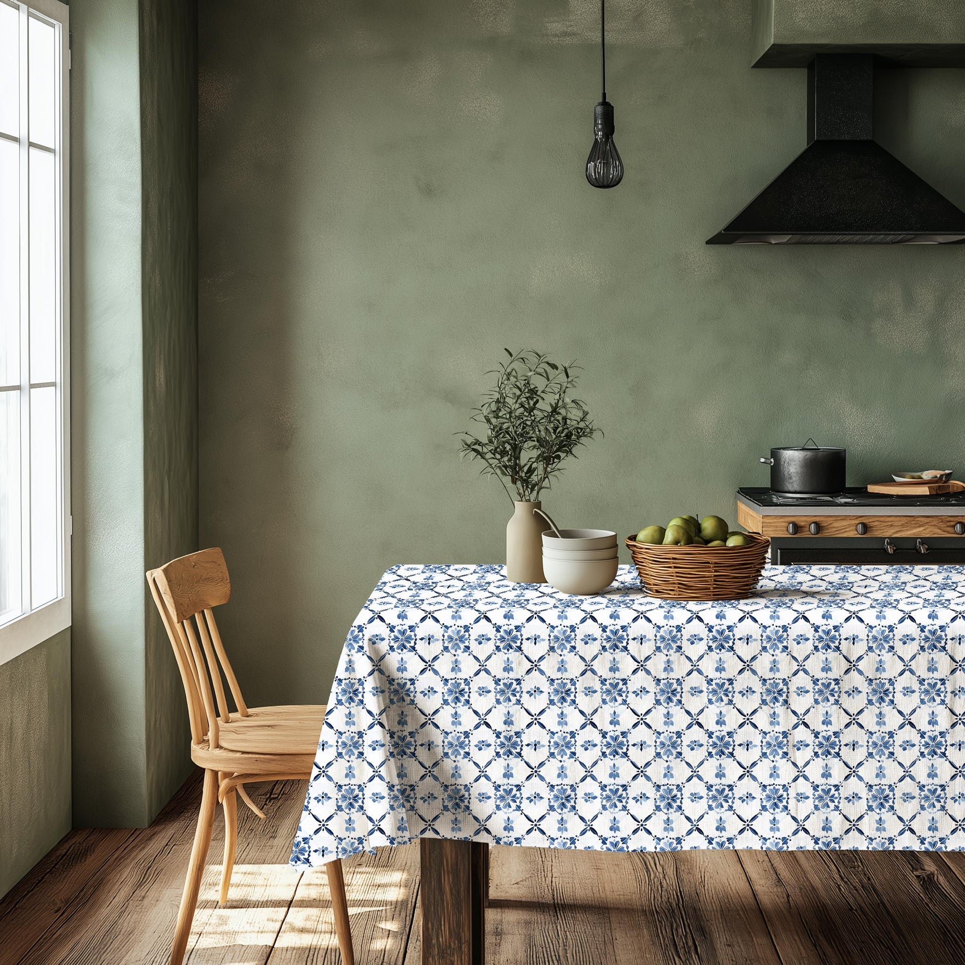 100% Linen tablecloth Swedish blue tiles Malmo print PREWASHED - table cloth rustic rectangle square oval - country Sack weave linen
