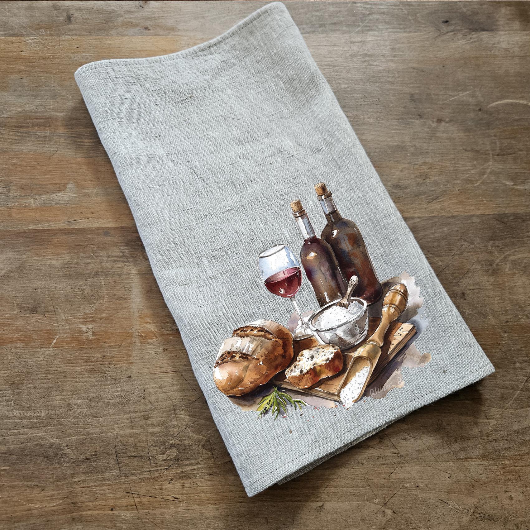 Bread & Wine Tea Towel in linen, Food lovers Hand Towels Tea, Farmhouse Dish Towel, Kitchen Décor Tea Towel