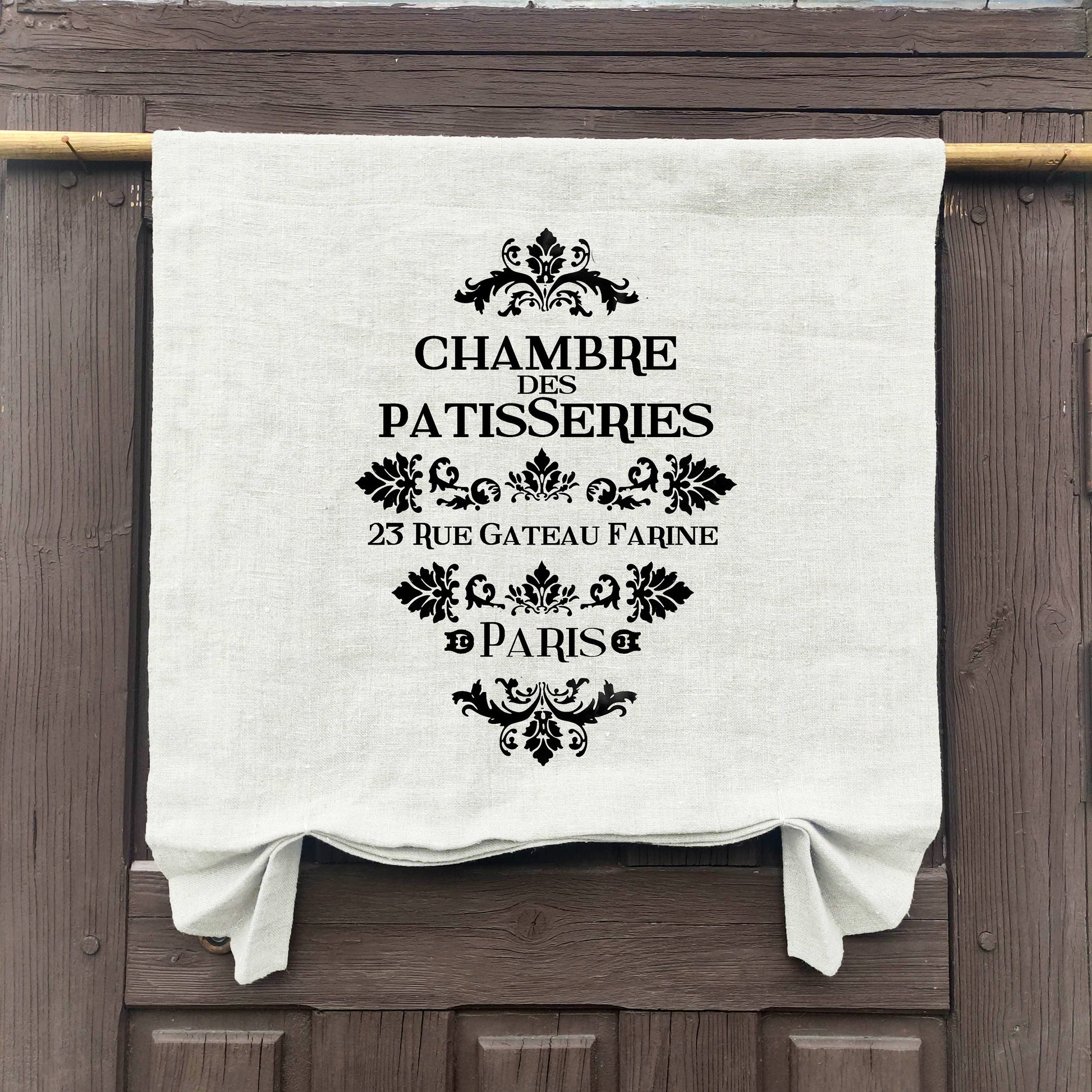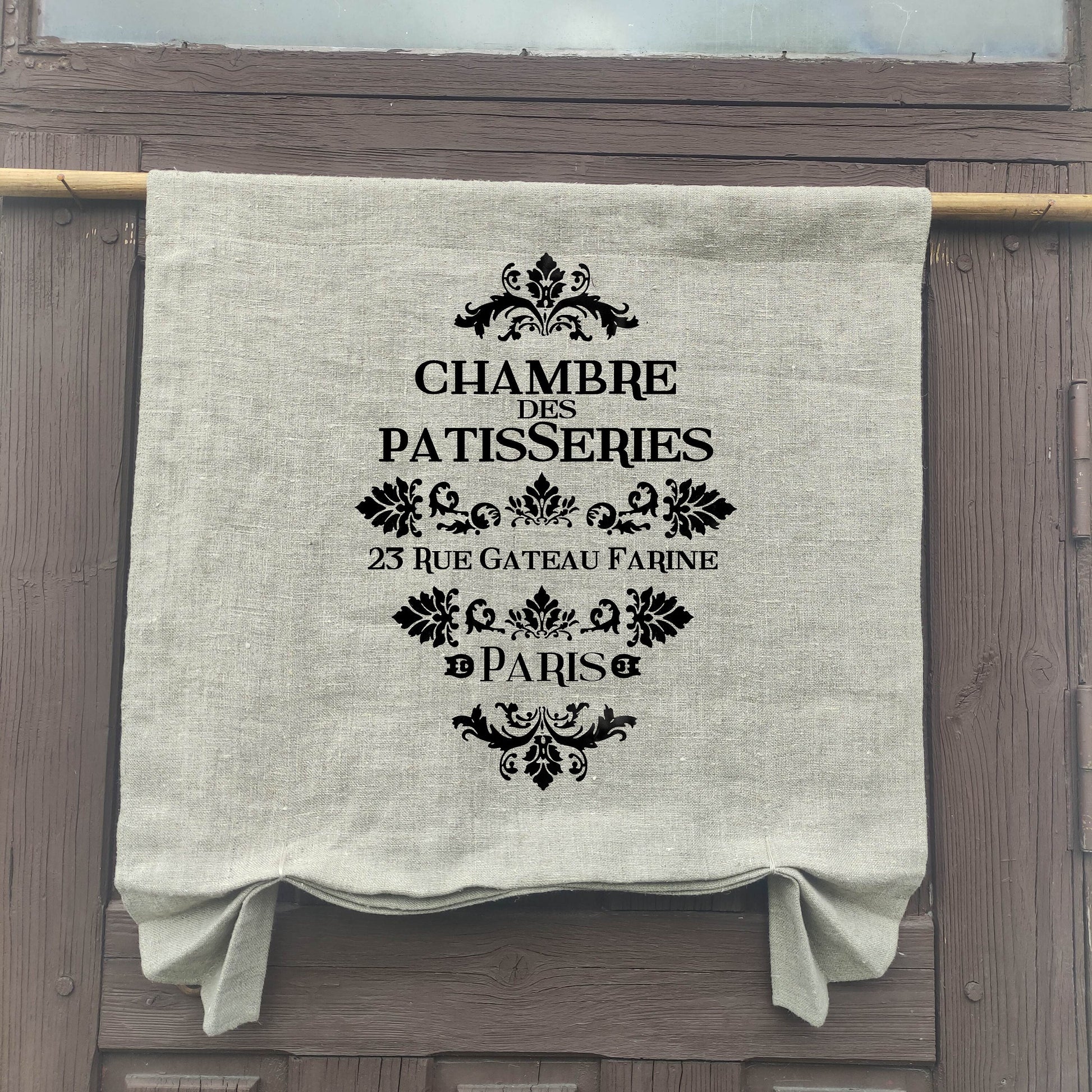 natural French Door Valance 1 Panel with Chambre des Patisseres stamp, white curtain panels for door window in linen